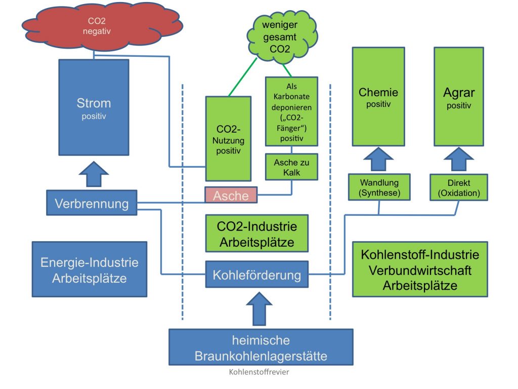 Sie können ermöglichen, Strom aus Braunkohle auch so herzustellen, dass Wirkungsgleichheit mit erneuerbaren Energien entsteht. CO2-Industrie und Kohlenstoff-Industrie sind die Schlüsselbegriffe.