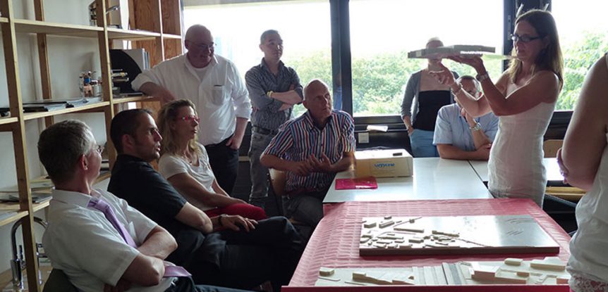 Die einzelnen Modelle wurden hinsichtlich ihrer Vor- und Nachteile einem strengen Blick unterzogen. V.l.: Technischer Beigeordneter Martin Höschen, Planungsamtsleiter Ralf Ritter (beide Stadtverwaltung Pulheim), Dagmar Klein, Architekt Erich Ermer, späterer Betreiber, Yaorong Su, Investor und Bauherr, der Pulheimer Unternehmer Heinz-Gerd Badziong, Frau Professor Eva-Maria Pape.
